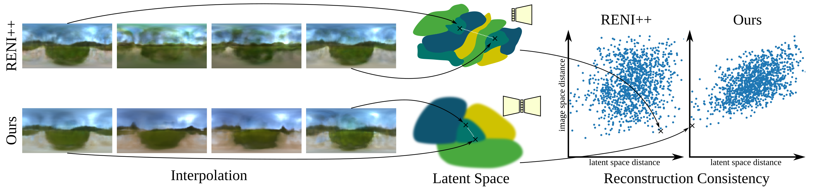 VENI achieves higher reconstruction quality compared to the current state of the art illumination prior (RENI++) and does especially well with low-dimensional latent spaces (27) compared to RENI++.